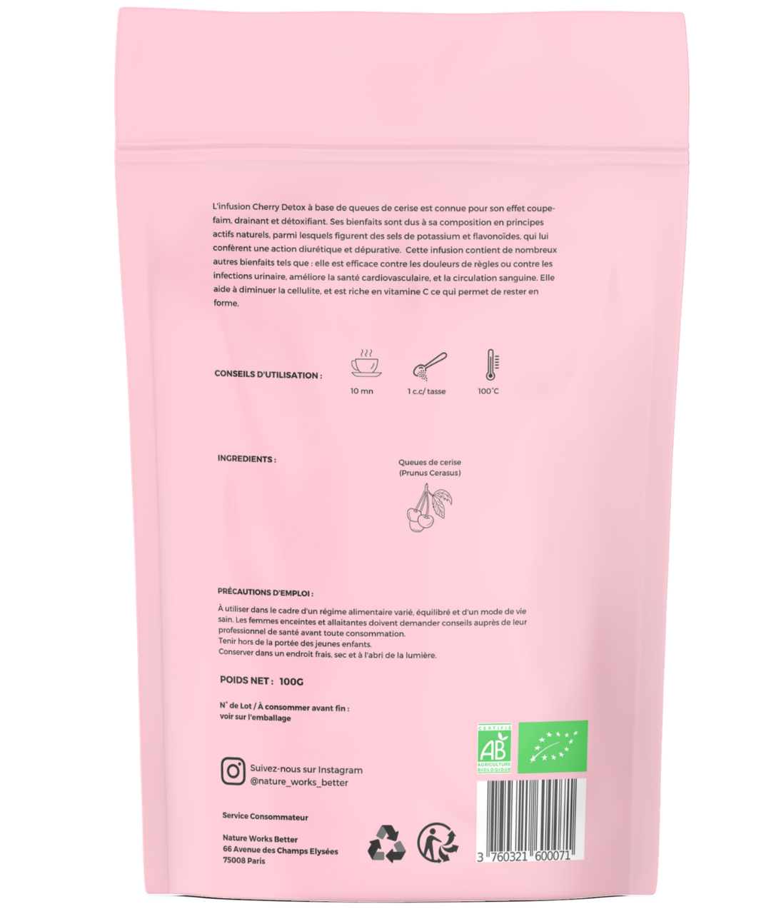 L'infusion Cherry Detox, avec son principe actif la Queue de cerise, utilisée en herboristerie pour ses propriétés d'éliminations, elle