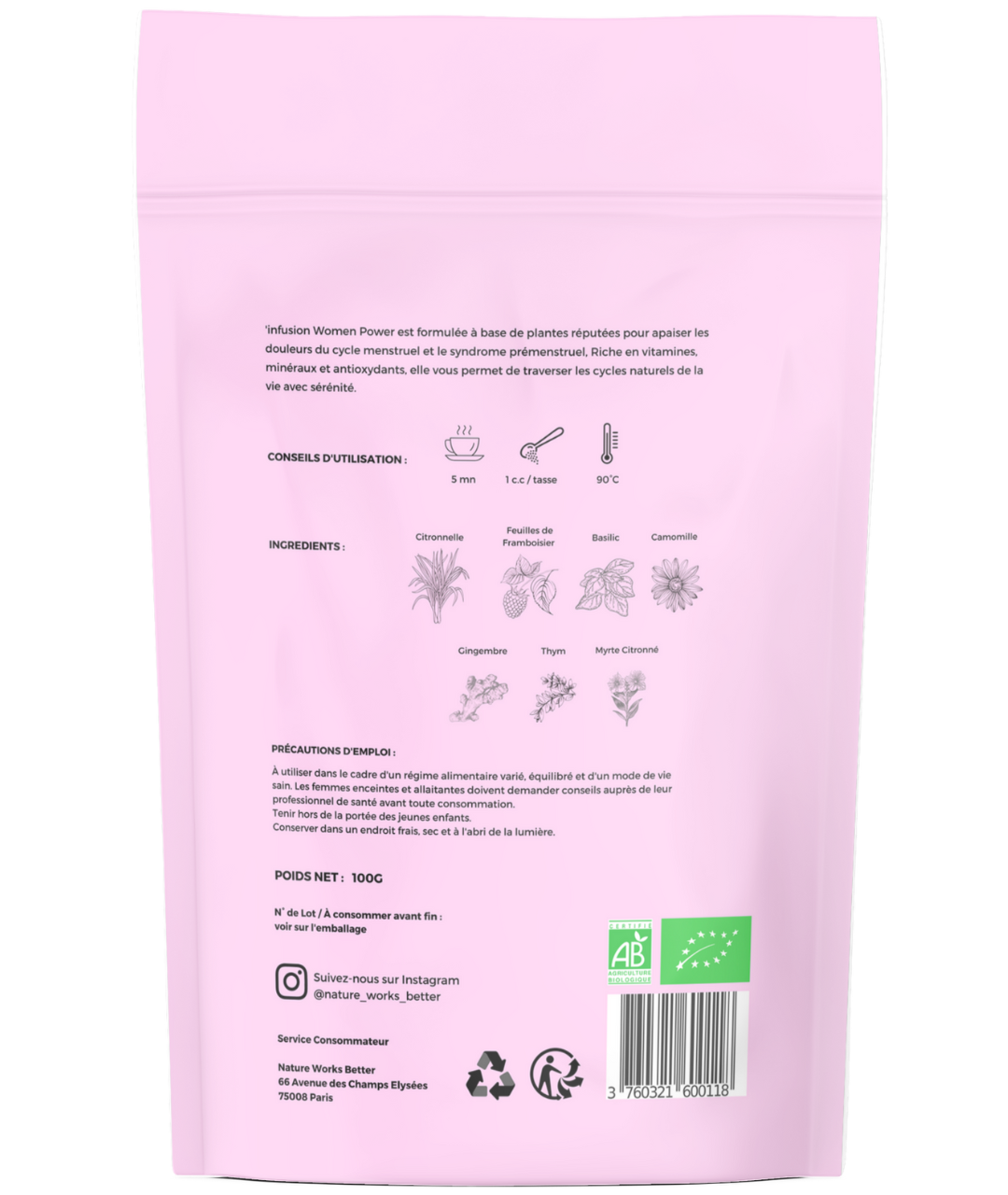 L'infusion Women Power est formulée à base de plantes réputées pour apaiser les douleurs du cycle menstruel et le syndrome prémenstruel.